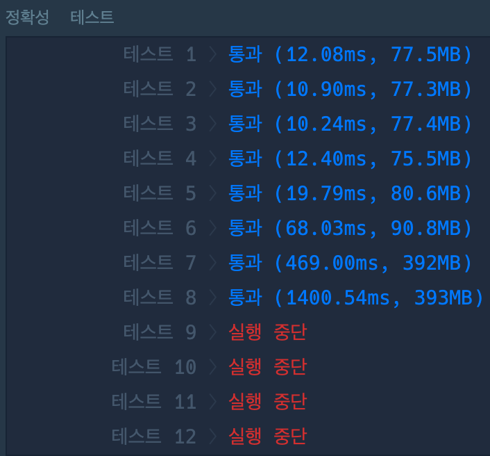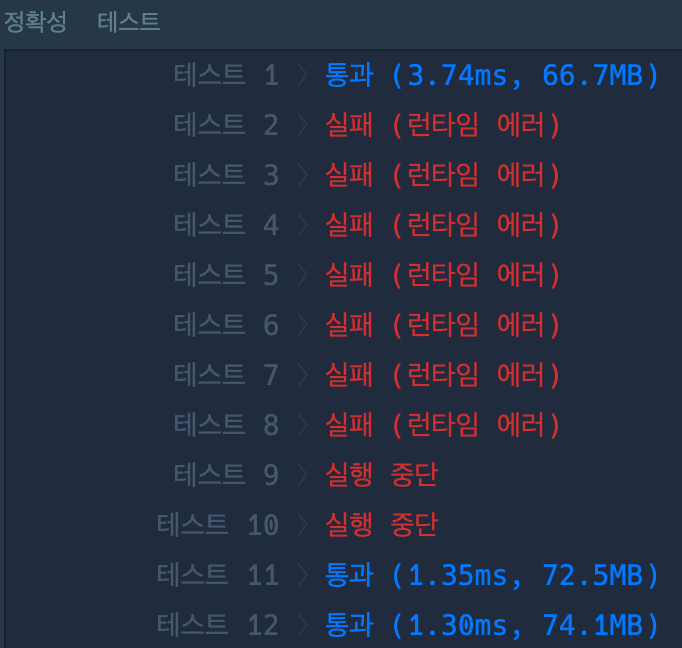 โก๏ธ ์ฃผ์ด์ง ํ ์คํธ ์ผ์ด์ค๋ ๋ชจ๋ ํต๊ณผํ์ง๋ง ์ ํ์ฑ ํ ์คํธ์์ ๊ฑฐ์ ์คํจํ์๋ค. ๋ค๋ฅธ ์ผ์ด์ค๋ค์ ๋ฃ์ด๋ณด์๋ ๋ฌธ์ ๊ฐ ์๋๋ฐ ์ ์๋์๊ฐ๋์ง๋ ๋ชจ๋ฅด๊ฒ ๋ค.