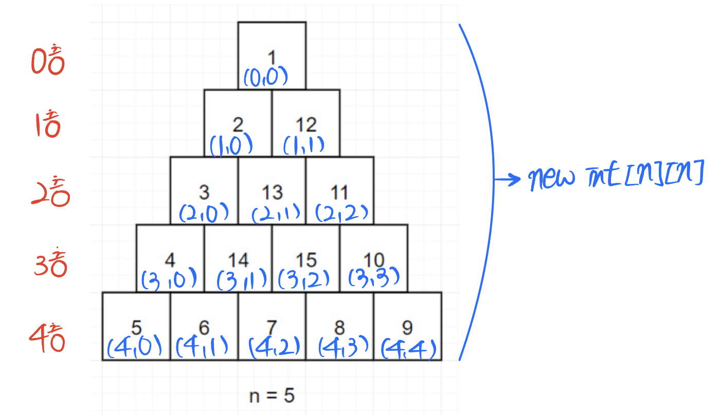 โก๏ธ ์ด๋ ๋ฐฉํฅ์ด ์๊ณ ๋ฐฉํฅ์ด๋ฏ๋ก โ ์๋ (down) / โก ์ค๋ฅธ์ชฝ (right) / โข ์ (up) ์์๋ฅผ ๋ฐ๋ณตํ๋ฉด์, ๋์์ ์ด๋ ํ์๋ ์ด๊ธฐ์ ์ฃผ์ด์ง๋ n ๊ฐ์์ ํ๋์ฉ ๊ฐ์ํ๋ ํํ๋ฅผ ๋ณด์๋ค. ๋ฐ๋ผ์ ํด๋น ๊ท์น์ ๋ฐํ์ผ๋ก ์ฝ๋๋ฅผ ๊ตฌ์ฑํ์๋ค.