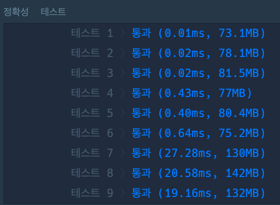 โก๏ธ ํ ์คํธ ์ผ์ด์ค๋ ๋ชจ๋ ํต๊ณผํ์์ผ๋, ํ์ฌ๋ ์กฐ๊ธ ๋นํจ์จ์ ์ธ ์ฝ๋๋ผ๊ณ ์๊ฐํด์ ํจ์จ์ฑ ํ ์คํธ๊ฐ ์์๋ค๋ฉด ์๊ฐ์ด๊ณผ๊ฐ ๋ฐ ์๋ ์์์ ๊ฒ ๊ฐ๋ค.