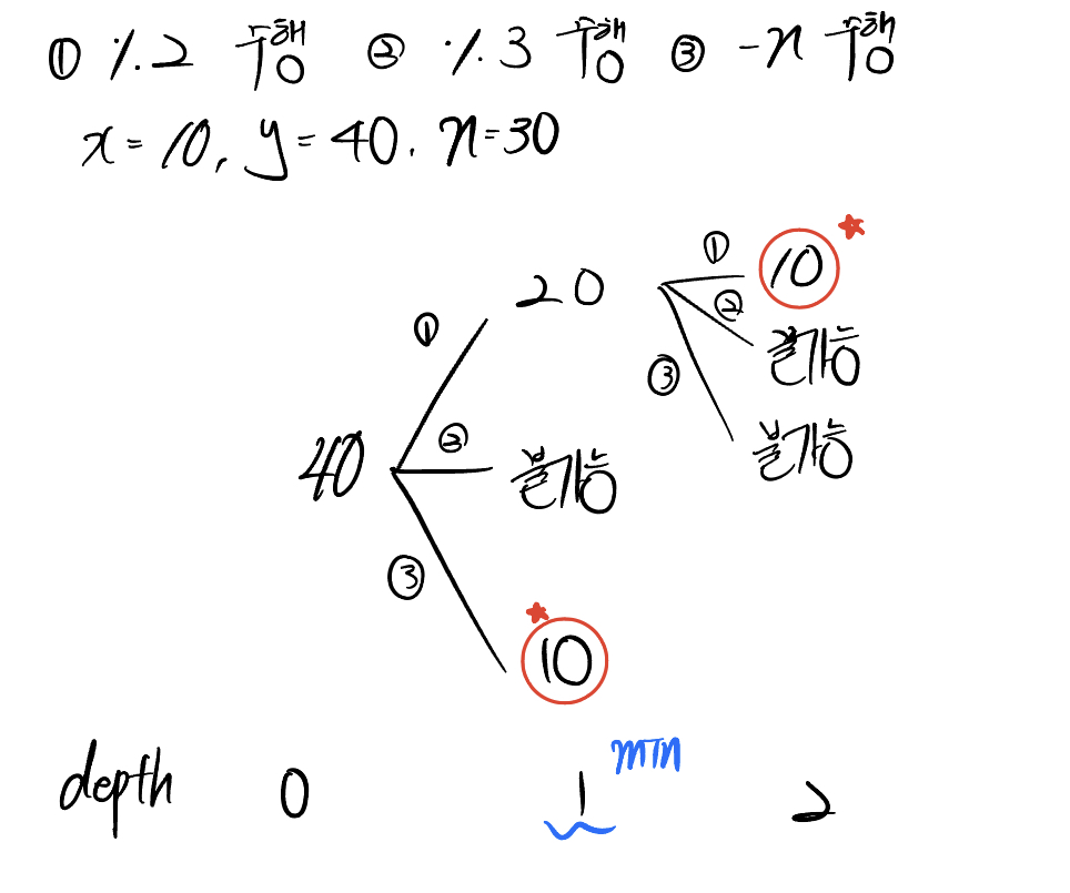 โก๏ธ ์ฐ์ฐ ๋ค์๋ ๋ชฉํํ๋ ๊ฐ (x) ์ ๋ณ๊ฒฝ๋ ๊ฐ y ๊ฐ ๊ฐ์์ง ํ์ธํ๊ณ , ๊ฐ์ ๊ฒฝ์ฐ ๊ธฐ์กด ์ต์๊ฐ๊ณผ ๋น๊ตํ์ฌ ๋ ์์ ๊ฐ์ ์ ์ฅํ๋ค.