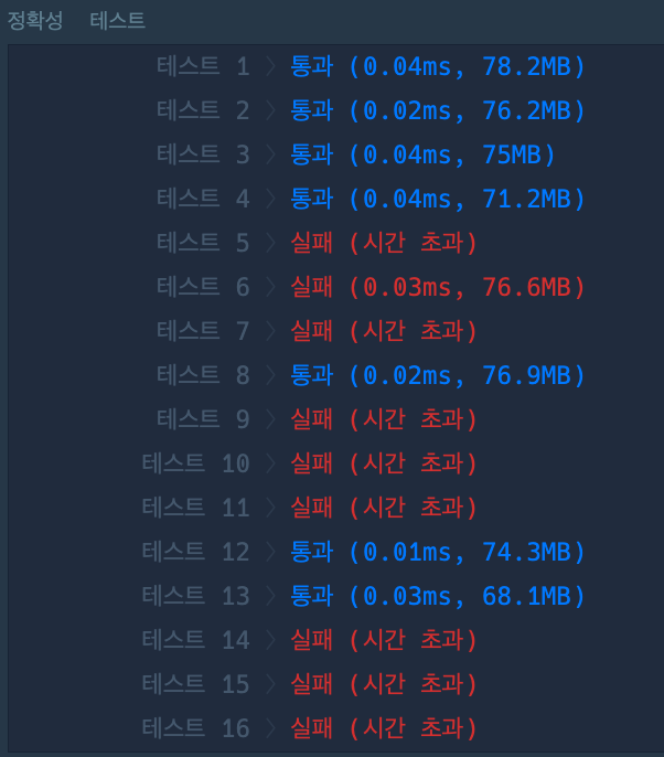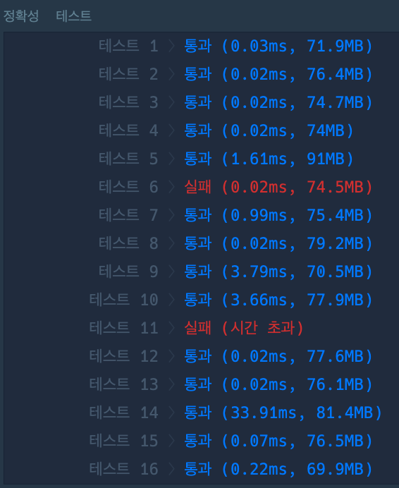 โก๏ธ ๊ทธ ๊ฒฐ๊ณผ ์๊ฐ์ด๊ณผ๋ก ์คํจํ๋ ๋๋ถ๋ถ์ ํ ์คํธ ์ผ์ด์ค๋ค์ ํต๊ณผํ ์ ์์๋ค. ์ด์ 6๋ฒ๊ณผ 11๋ฒ ํ ์คํธ์ ์คํจ ์์ธ์ ์๊ฐํด๋ณด์์ผํ๋ค.