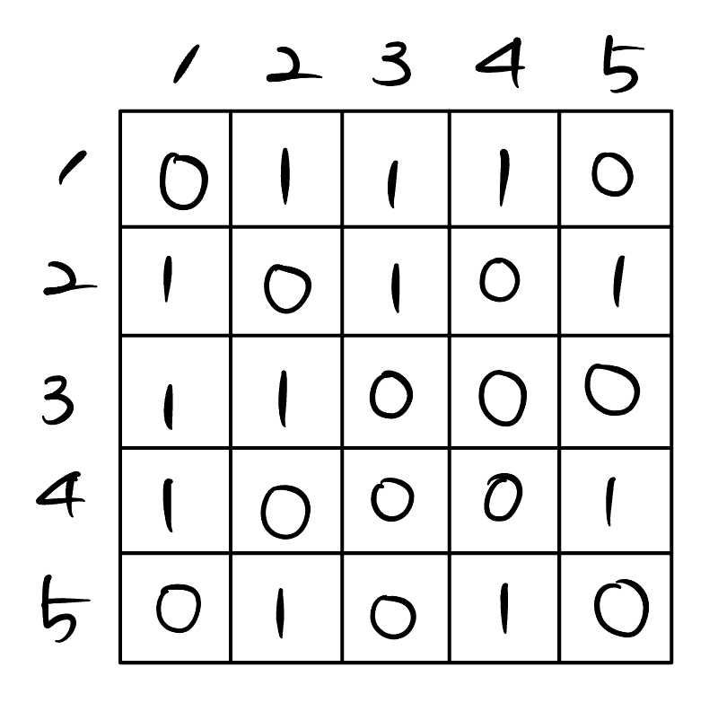โก๏ธ ์๋ก์ ์ฐ๊ฒฐ ์ฌ๋ถ๋ฅผ ๊ธฐ๋กํ boolean ํ์ 2์ฐจ์ ๋ฐฐ์ด ์์ฑ (์ฐ๊ฒฐ : 1 / ๋น์ฐ๊ฒฐ : 0)