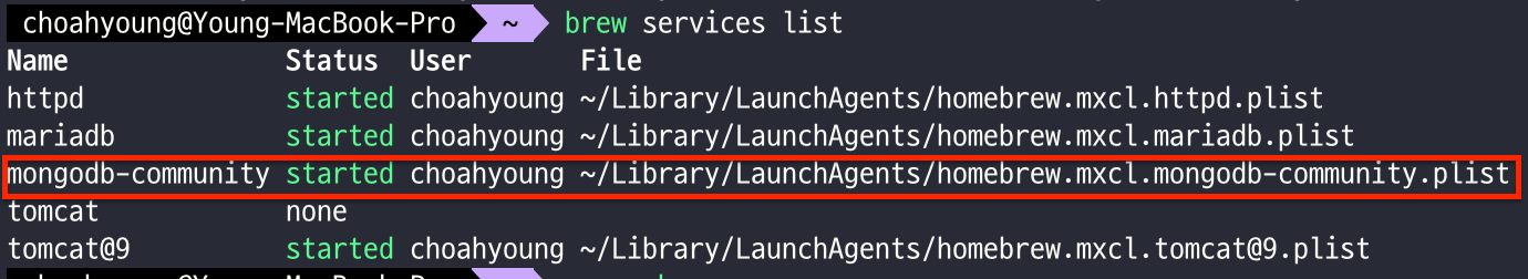 โก๏ธ MongoDB ๋ฅผ ์คํ์์ผ์ฃผ๊ณ brew ๋ฅผ ํตํด ์๋น์ค ๋ชฉ๋ก์ ํ์ธํ๋ฉด ์คํ ์ฌ๋ถ๋ฅผ ํ์ธ ํ ์ ์๋ค.