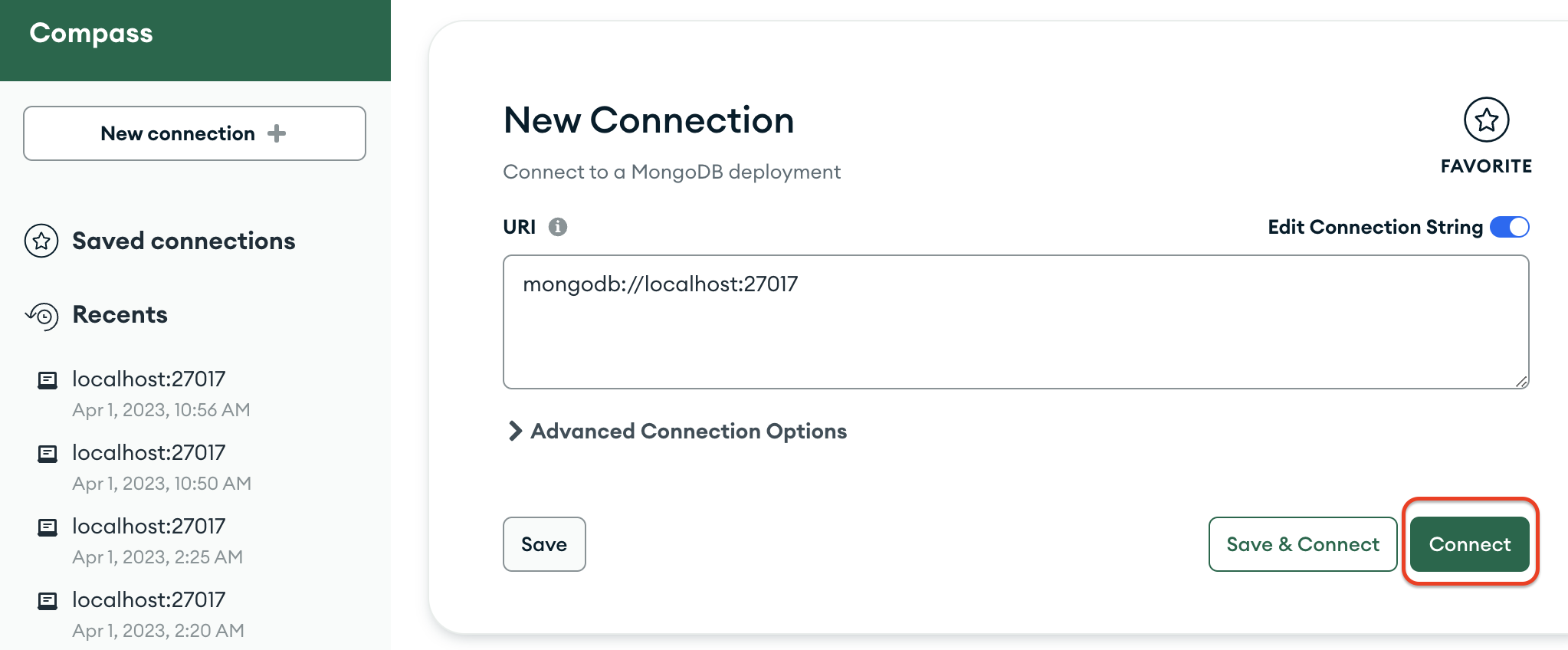 โก๏ธ ์์ ๊ณผ์ ์ ํตํด MongoDB ๊ฐ ์ ์ค์น๋์์ผ๋ฉด Connect ๋ก ์ ์ํ์ ๋ ์ ์์ ์ผ๋ก ํ๋ฉด์ด ์ ํ๋๋ค.