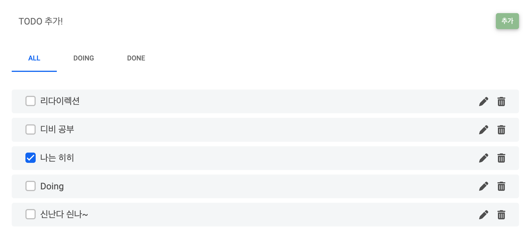 νλ‘μ νΈ μ€ ToDo 리μ€νΈλ₯Ό λ΄λΉνκ² λμλλ° ENUM (-> DOING κ³Ό DONE) ννλ‘ μ μ₯ν type μ λ°λΌ DOING μ΄λ©΄ 체ν¬λ°μ€κ° ν΄μ λκ³ DONE μ΄λ©΄ 체ν¬λ°μ€κ° νμ±νλλ κ³Όμ μ νμ리νλ₯Ό νμ©νμ¬ κ΅¬νν΄λ³΄κ³ μ νλ€.