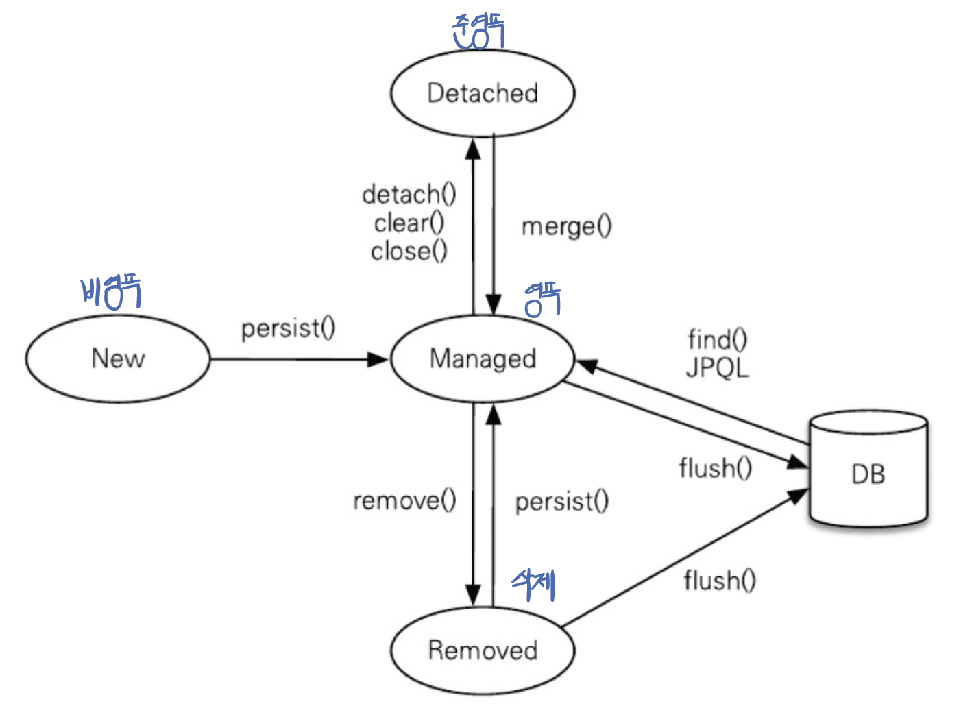 - em.find() λ JPQL(β‘οΈ DB μ μ κ·Όνλ €λ©΄ λ°μλμ΄μΌνκΈ° λλ¬Έμ) μ μ¬μ©ν΄μ μ‘°νν μν°ν°λ μμ μνμ΄λ€.