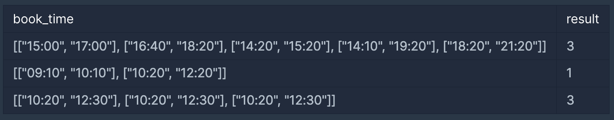 - book_time[i]λ ["HH:MM", "HH:MM"]μ ννλ‘ μ΄λ£¨μ΄μ§ λ°°μ΄μ