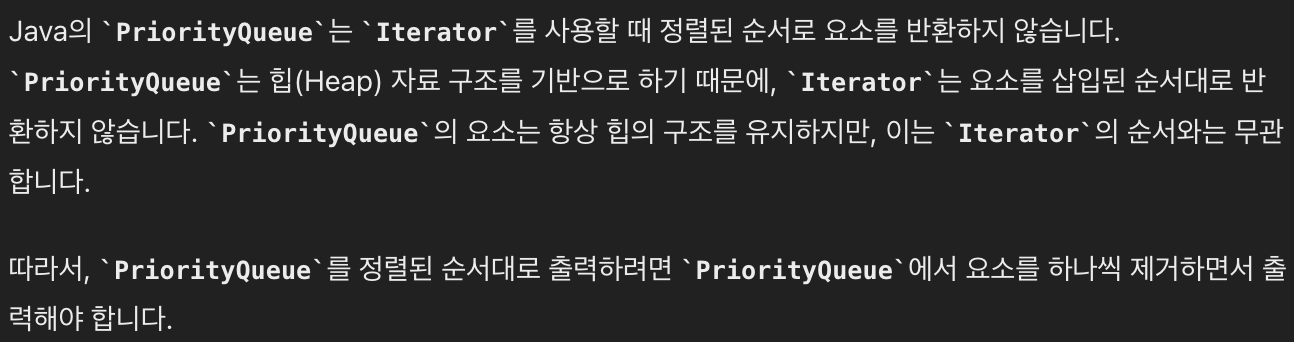 ์ฃผ์ โ ๏ธ : PriorityQueue ์ ์์๋ฅผ ํ์ธํ๊ณ ์ถ์ ๋๋ ํฅ์๋ for ๋ฌธ์ด ์๋, poll ์ ํตํด ํ์ธํ๋ ๋ฐฉ์์ผ๋ก ์งํํด์ผํ๋ค.