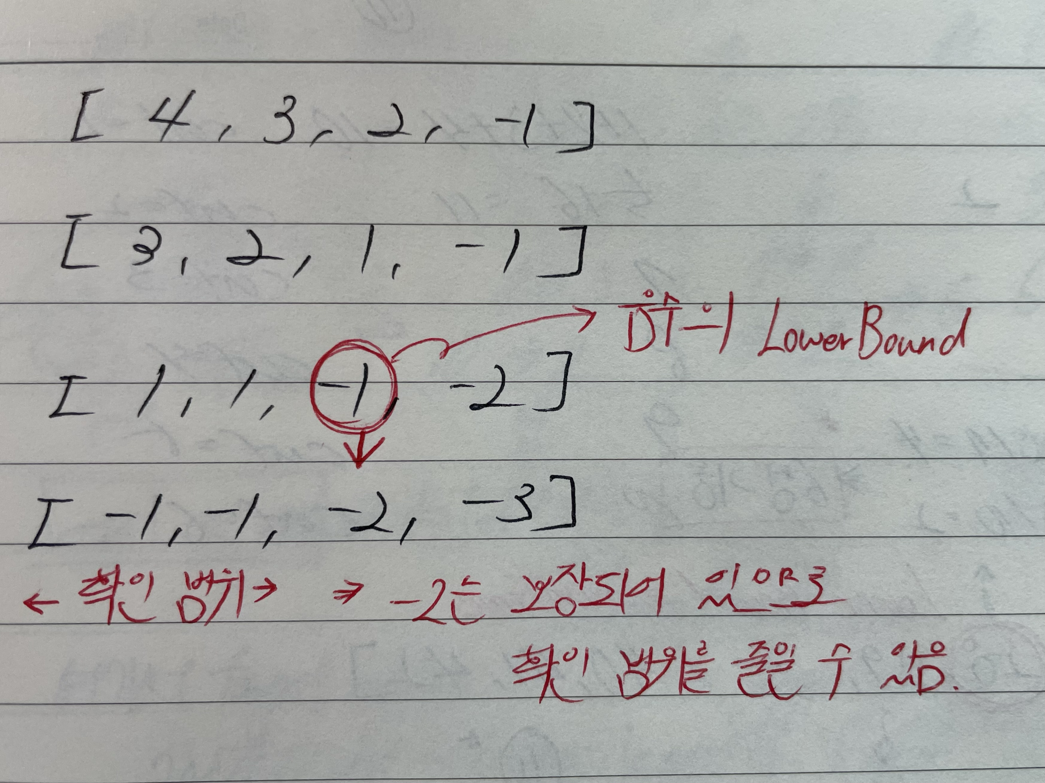 ๐ก IDEA : ์ ๋ ฌ๋์ด์๋ ๋ฐฐ์ด์ด๋ฏ๋ก ์ด๋ถํ์์ ํตํด ํ์ ์๋๋ฅผ ๋์ธ๋ค. ์ด๋, ์์๋์ ๋ํด์๋ ์ ๋ ฌ์ด ๋์ด์์์ผ๋ก ๋ค์ ๋ฐฐ์ด ํ์์ ์ ๋ฐฐ์ด ํ์ ๊ฒฐ๊ณผ๋ฅผ ๋ฐํ์ผ๋ก ๋ฒ์๋ฅผ ์ขํ์ ํ์ํ ์ ์๋ค.