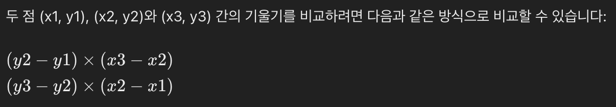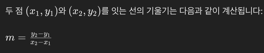 โก๏ธ ์ผ๋ฐ์ ์ผ๋ก ๊ธฐ์ธ๊ธฐ ๊ณ์ฐ์ ์ฌ์ฉํ๋ (y2 - y1) / (x2 - x1) ์ double ์๋ฃํ์ ํตํด์ ๋น๊ตํ๋ฉด ์ ํํ ๋น๊ต๊ฐ ๋ ์ ์์ ๊ฒ์ด๋ผ๊ณ ์๊ฐํ๊ณ , ํด๋น ์์ด๋์ด๋ฅผ ๋ฐํ์ผ๋ก ์๋์ ๊ฐ์ด ๋น๊ต ์ฝ๋๋ฅผ ์์ฑํ์๋ค.