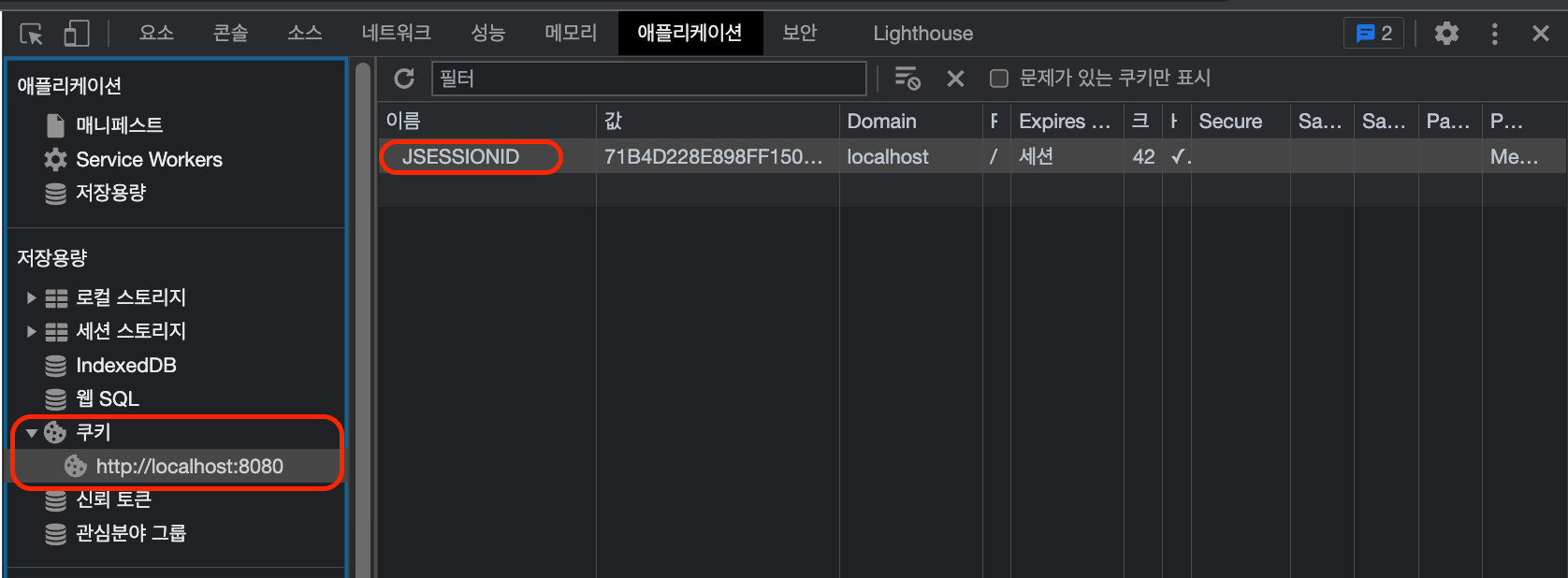 F12 λ‘ κ°λ°μ λꡬλ₯Ό μ΄μ΄μ μΏ ν€μμ JSESSIONID κ° μλ κ²μ νμΈ ν μ μλ€.
