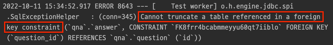 Cannot truncate a table referenced in a foreign key constraint (`qna`.`answer`, CONSTRAINT `FK8frr4bcabmmeyyu60qt7iiblo` FOREIGN KEY (`question_id`) REFERENCES `qna`.`question` (`id`))