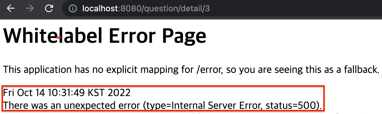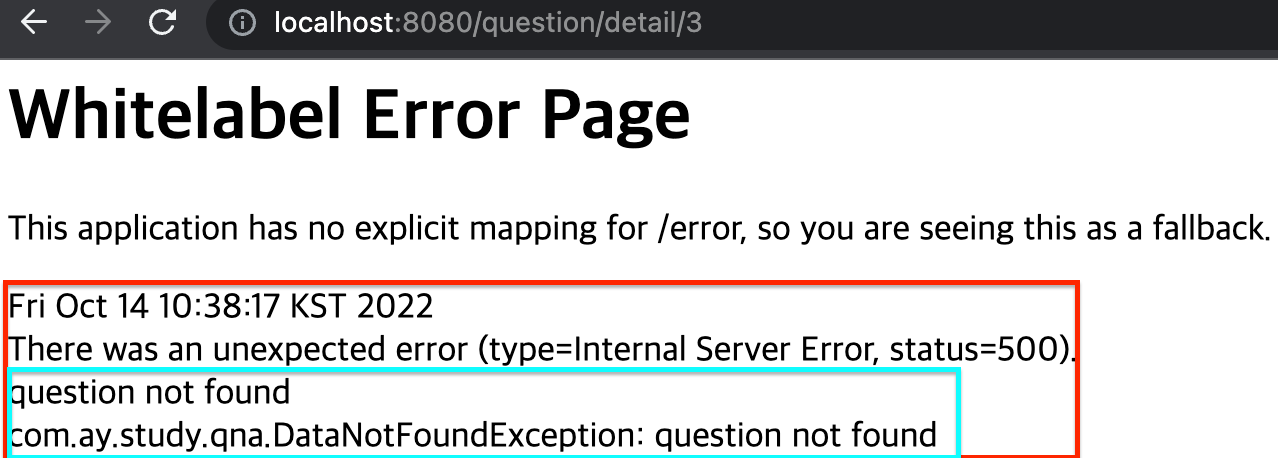 ์์ฑ์ ์ถ๊ฐํ ์๋ก ์ด๋ค ์ด์ ๋ก ์ค๋ฅ๊ฐ ๋ฐ์ํ๋์ง ์ฝ๊ฒ ํ์ ํ ์ ์๊ณ , ๋ง์ฝ ์ค๋ฅ๊ฐ ์ผ์ด๋ฌ๋๋ฐ DataNotFoundException ์ด ๋จ์ง ์๋๋ค๋ฉด ๋ค๋ฅธ ์ค๋ฅ๋ ์์ฌํด ๋ณผ ์ ์๋ค.