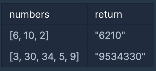 0 ๋๋ ์์ ์ ์๊ฐ ๋ด๊ธด ๋ฐฐ์ด numbers๊ฐ ๋งค๊ฐ๋ณ์๋ก ์ฃผ์ด์ง ๋, ์์๋ฅผ ์ฌ๋ฐฐ์นํ์ฌ ๋ง๋ค ์ ์๋ ๊ฐ์ฅ ํฐ ์๋ฅผ ๋ฌธ์์ด๋ก ๋ฐ๊พธ์ด return ํ๋๋ก solution ํจ์๋ฅผ ์์ฑํด์ฃผ์ธ์.