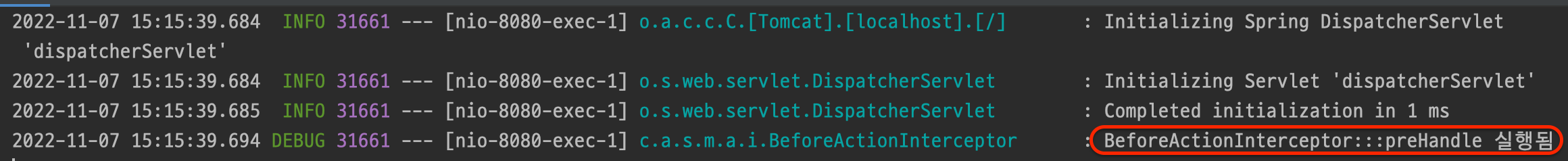 log.debug("BeforeActionInterceptor:::preHandle μ€νλ¨");