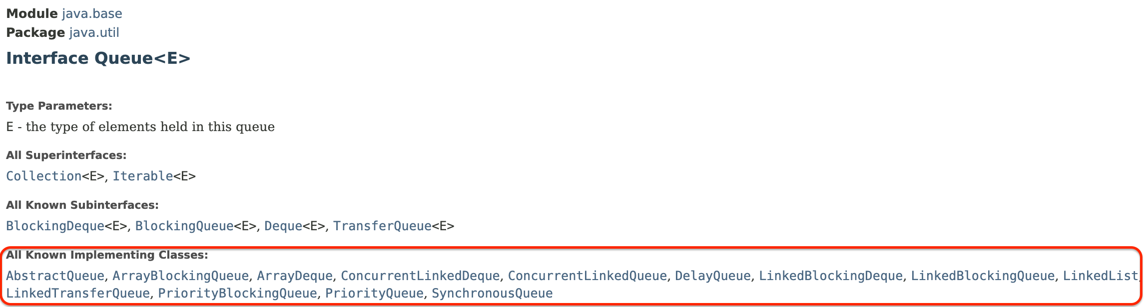 Queue ์ธํฐํ์ด์ค๋ฅผ ๊ตฌํํ ํด๋์ค๋ค์ ์๋ ๋งํฌ์ ๋ ํผ๋ฐ์ค ๋ด์ฉ ์ค Alll Known Implementing Classes ๋ฅผ ํ์ธํ๋ฉด ํ ์ ์๋ค.